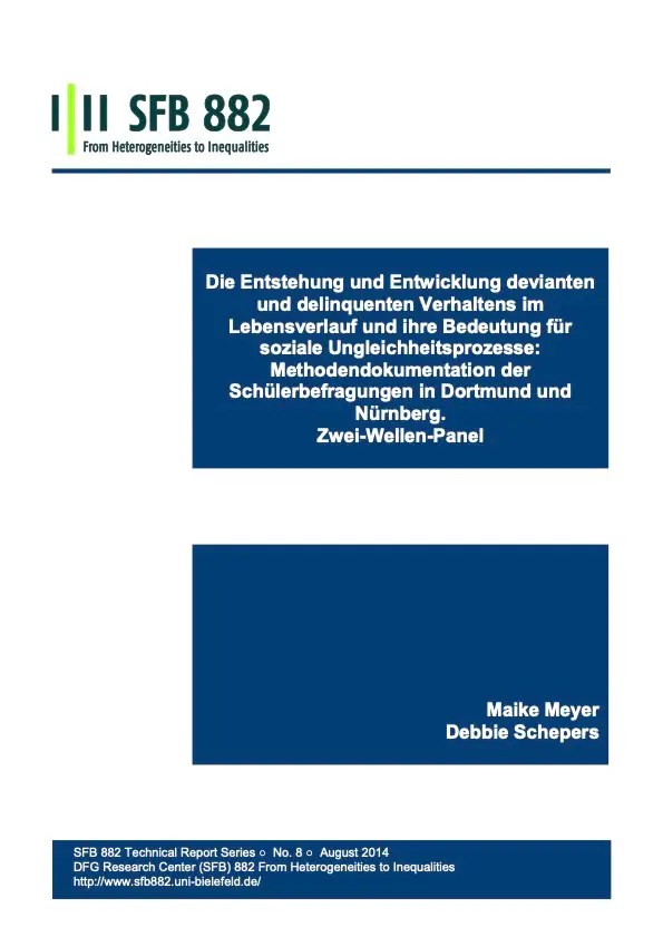 Der Datensatz enthält N=2998 Fälle der zweiten Welle der im Jahr 2013 in den Städten Dortmund und Nürnberg durchgeführten Jugendbefragung. Die Daten wurden zum einen als PAPI-Befragung im Klassenverband durchgeführt, zum anderen wurden die Jugendlichen die nicht (mehr) in Schulen zu erreichen waren postalisch befragt. Der inhaltliche Fokus der Befragung liegt auf selbstberichteten devianten und delinquenten Verhaltensweisen. Ziel der Befragung ist es, die Entstehung, Entwicklung und Ursachen von Devianz und Delinquenz mit einem Kohorten-Sequenz-Design zu untersuchen. Den theoretischen Hintergrund bilden u.a. die Situational Action Theory (Wikström) und die Age-Graded-Theory of Informal Social Control (Sampson & Laub). Der Datensatz enthält neben dem umfangreichen Selbstbericht devianten und delinquenten Verhaltens Skalen zum Freizeitverhalten, Freundschaften, Persönlichkeit, Werteinstellungen, Familie und Erziehung, Nachbarschaft, Schulklima und Demografie.